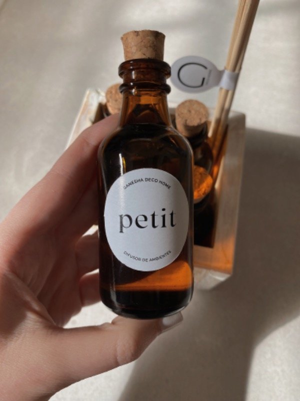 Caja de madera con 4 difusores petit de color ambar con aromas variados (no a elección) , y varillas de rattan.